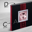 Obal je rozdelený na štyri časti, časť "A", časť "B", chrbát knihy časť "C" a zadná časť knihy "D". Pre všetky štyri časti si je možne vybrať odlišné obalové materiály. Všetko záleží len od Vašej fantázie. Niektoré obalové materiály je možné doplniť individuálnou slepotlačou.